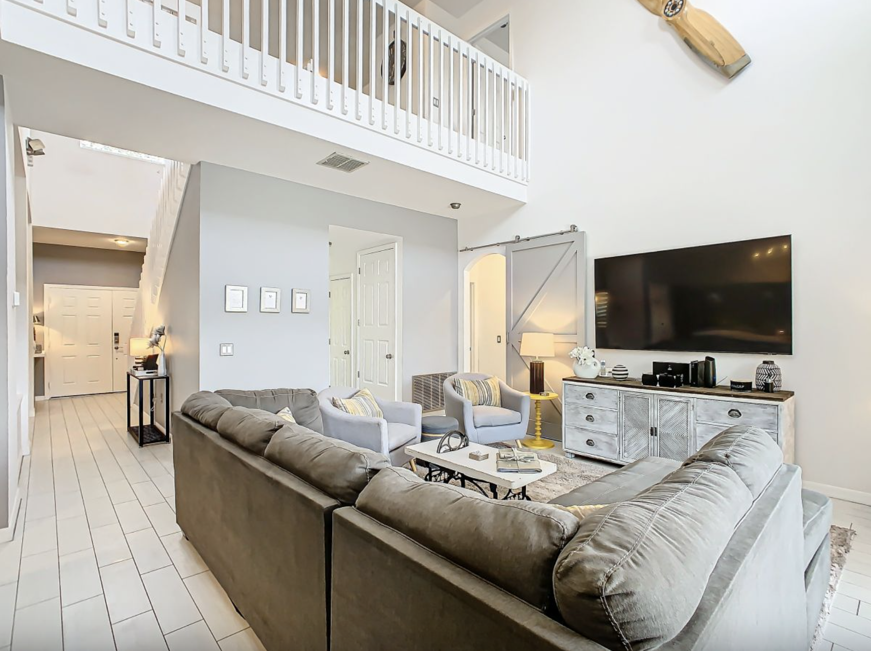 On the ground floor are two of the three queen bedrooms, the first has patio doors with direct access to the pool deck, it has a 32" wall mounted flatscreen TV with cable/Roku, the second queen bedroom also has a 32" wall mounted smart Roku flatscreen TV, both share the first of the 3 full bathrooms.